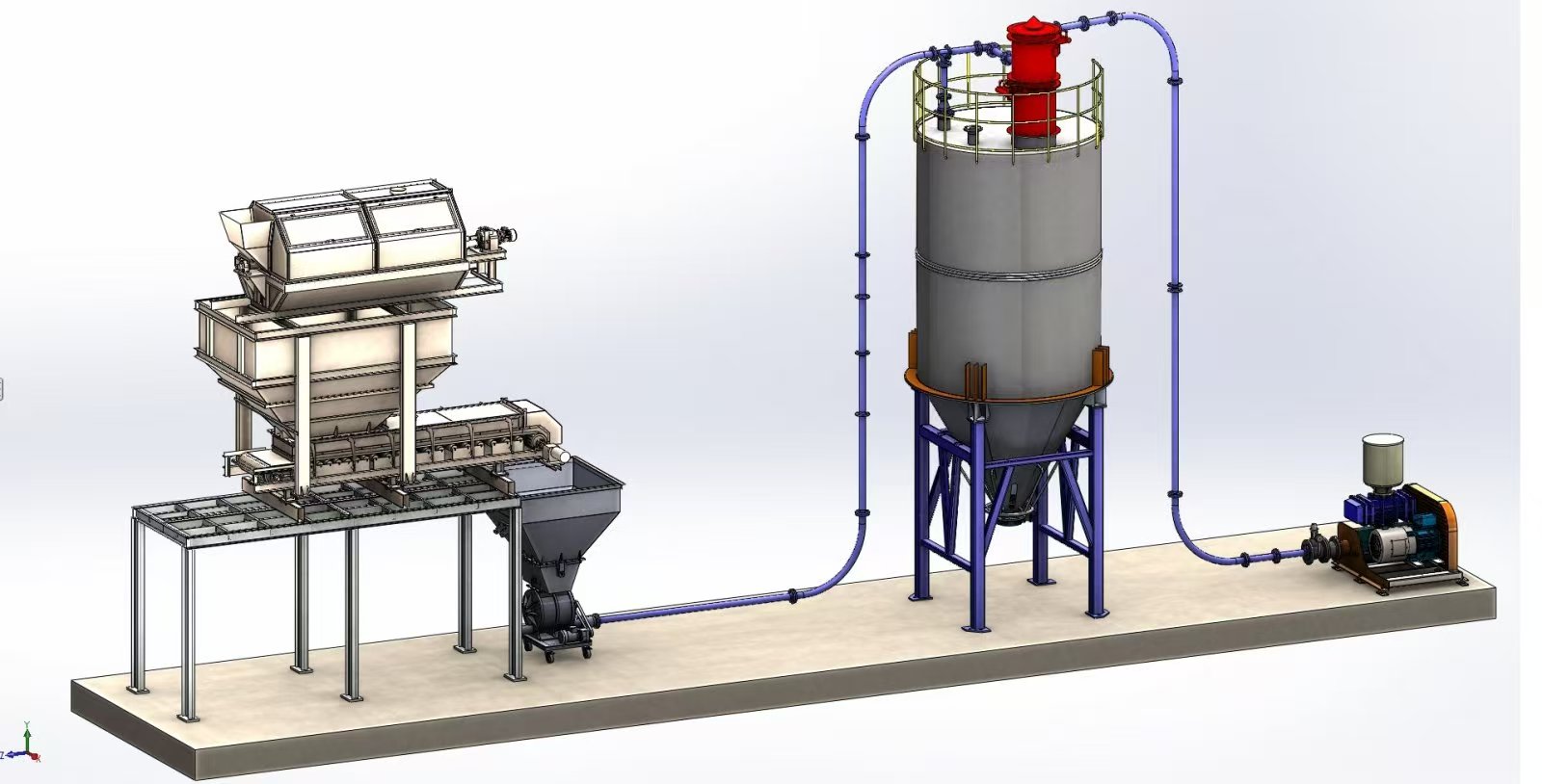 气力输送设备:包括风机设备、供料设备、电气设备、除尘设备、收集设备、管道设备、阀门设备、控制设备等,适用于稀相、浓相等各种粉料颗粒料的输送设备、是常见的一种气力输送设备,主要是通过罗茨风机或者空压机提供高压气流,然后再通过仓泵和旋转供料器把下来的料、输送到指定的位置、一般稀相输送系统的数据距离在5-300米内、浓相距离